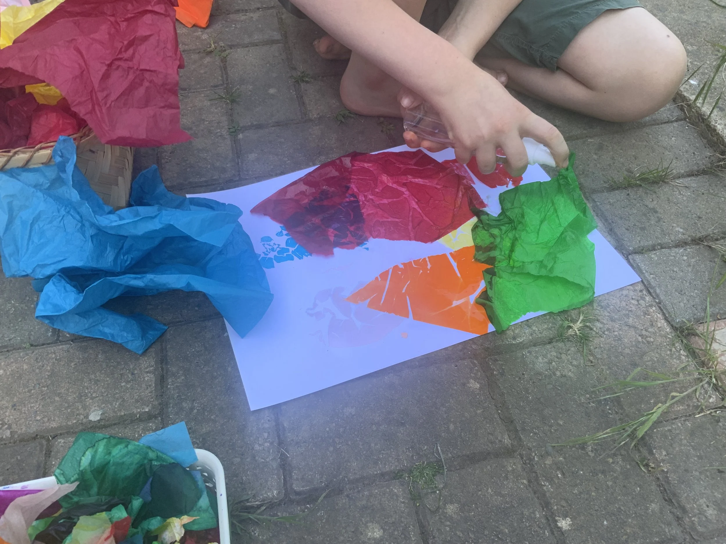 Wracking my brains for something bright and exciting, and maybe vaguely reminiscent of butterflies, my eye landed on the pack of A3 photo paper sat on a shelf. Thank goodness for a well-stocked studio of stuff I find hard to throw out! I passed each child a piece of photo paper, pulled out my stash of tissue paper, and a water spray each.